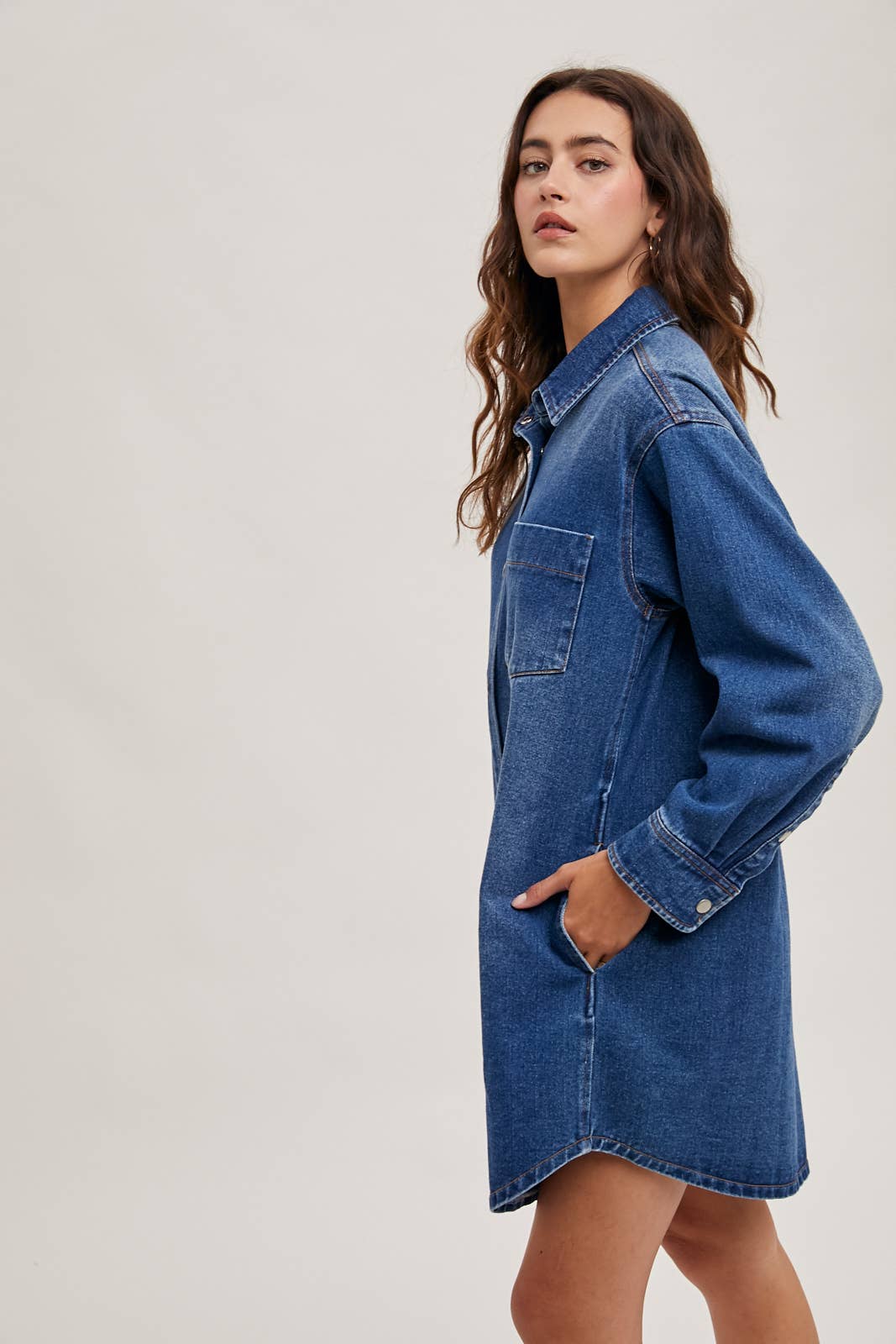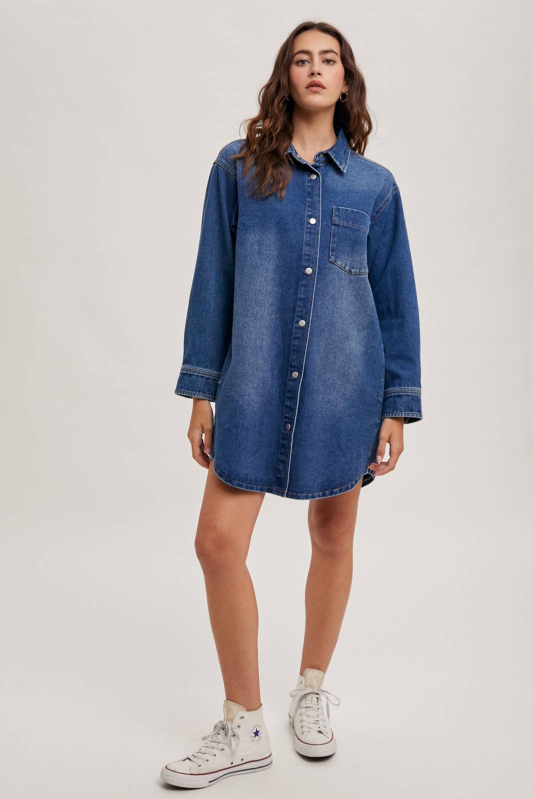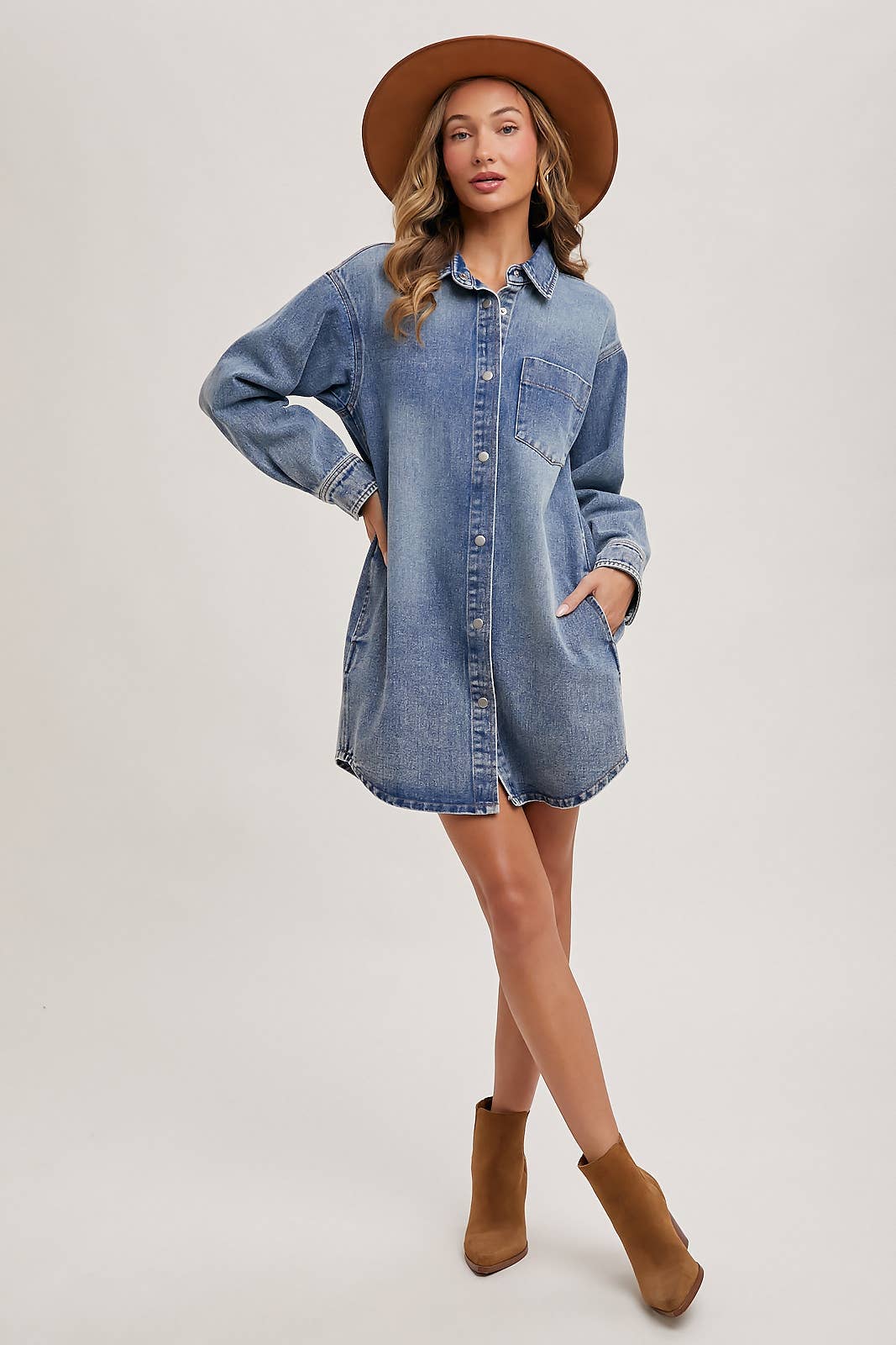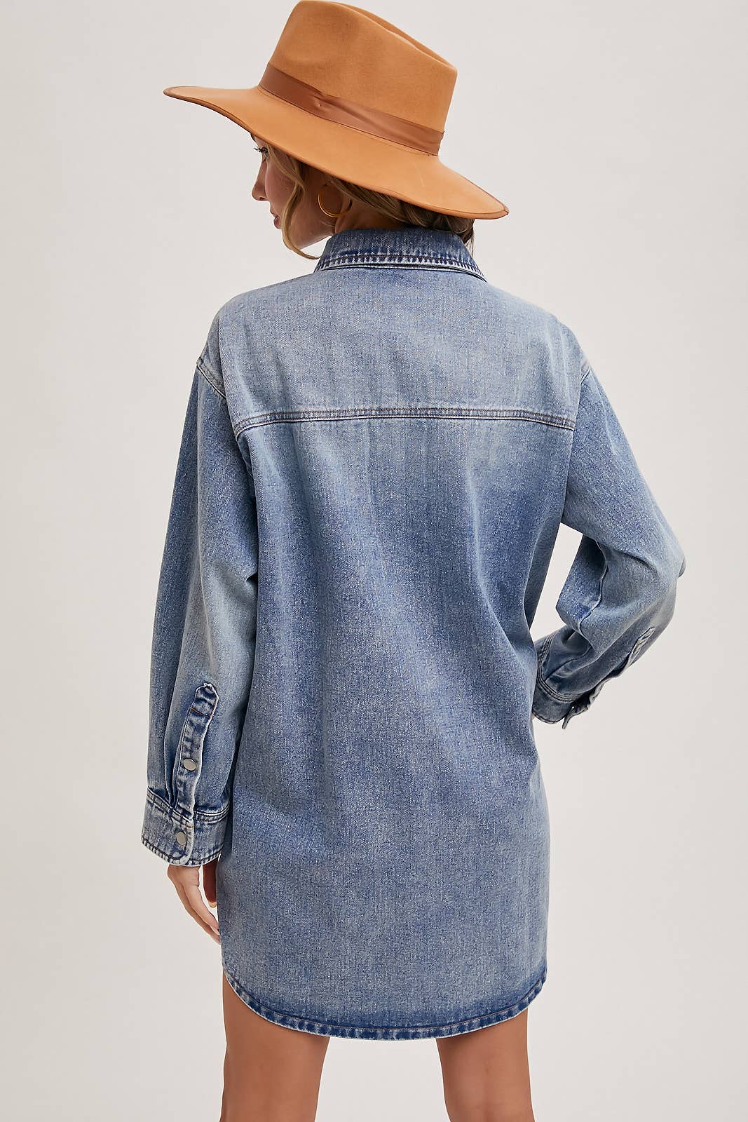 DENIM BUTTON DOWN SHIRT DRESS WITH POCKETS
