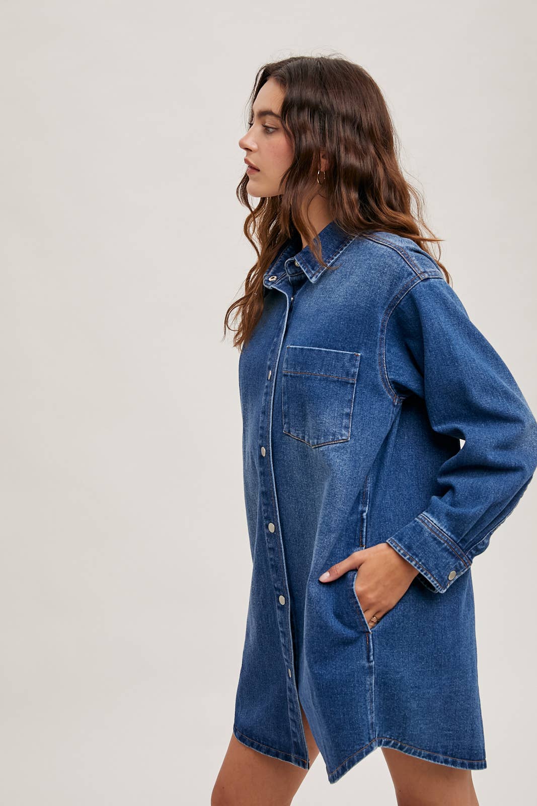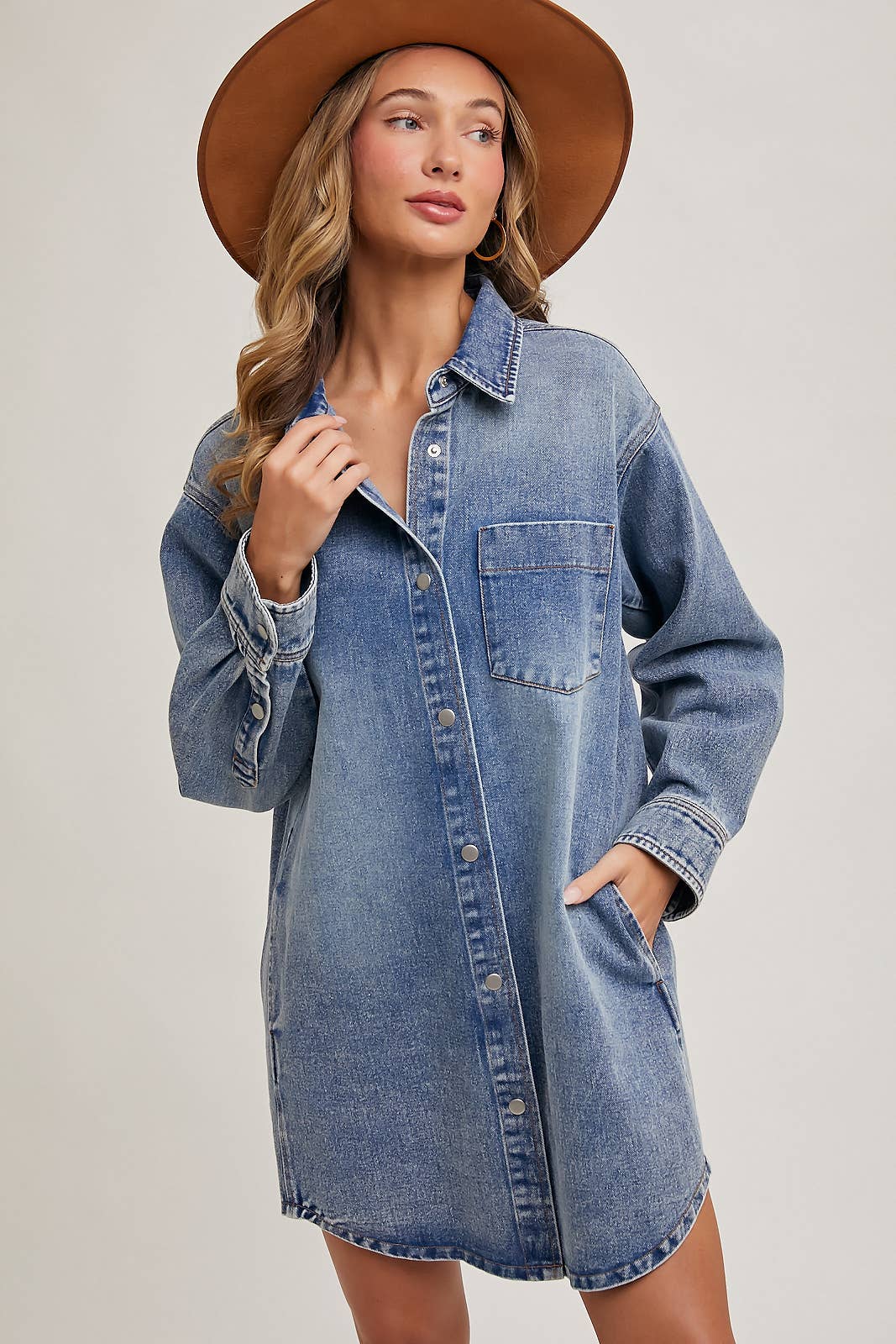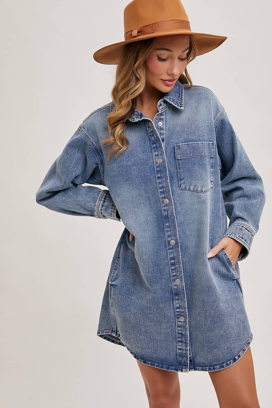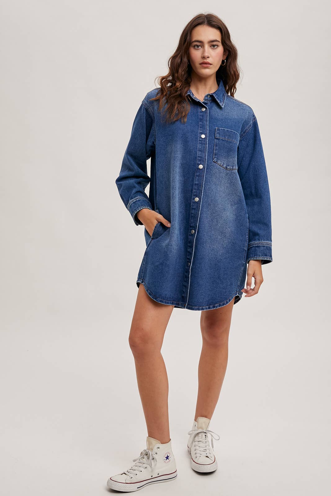DENIM BUTTON DOWN SHIRT DRESS WITH POCKETS