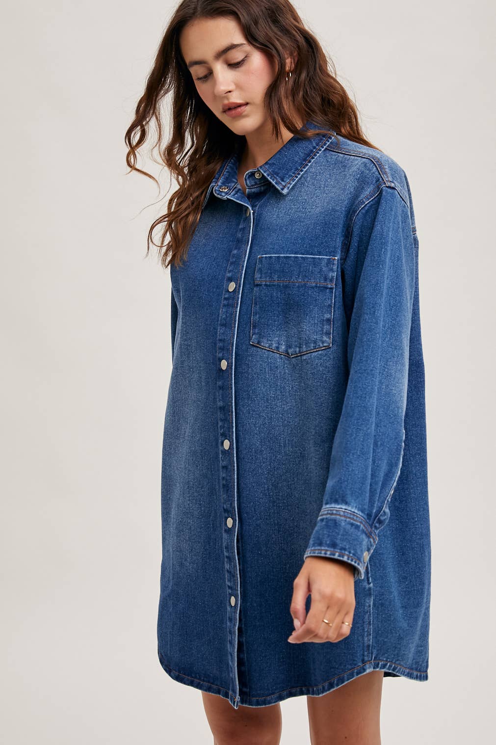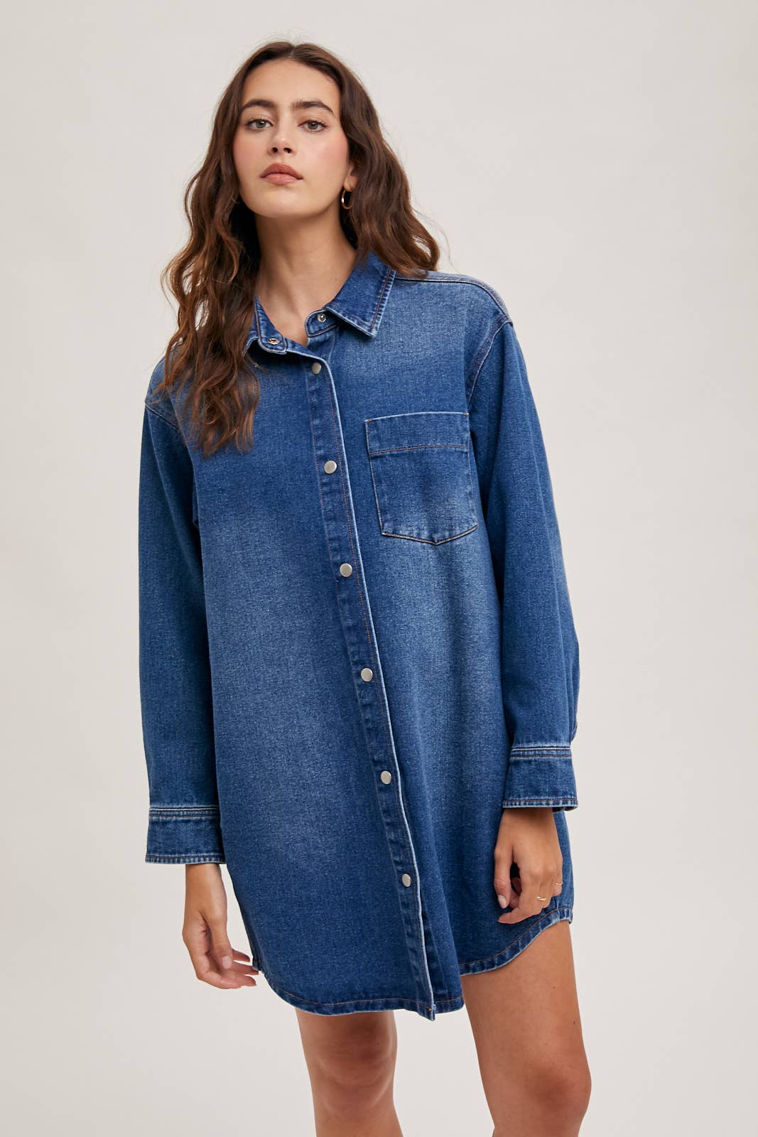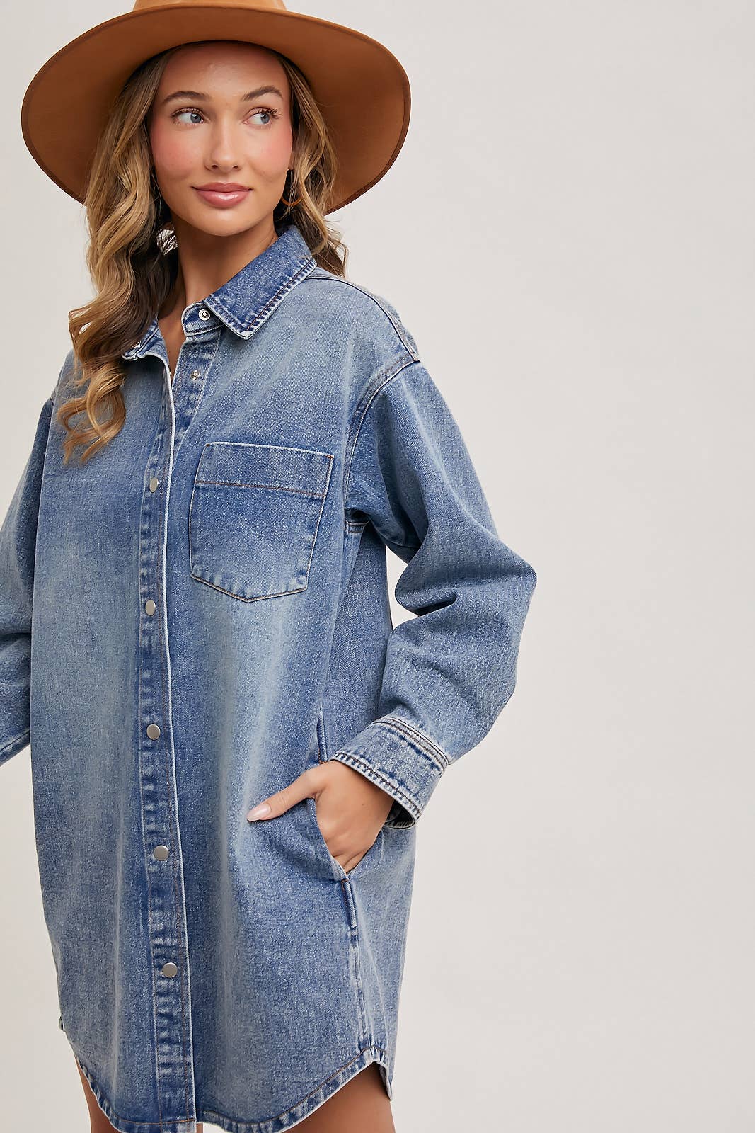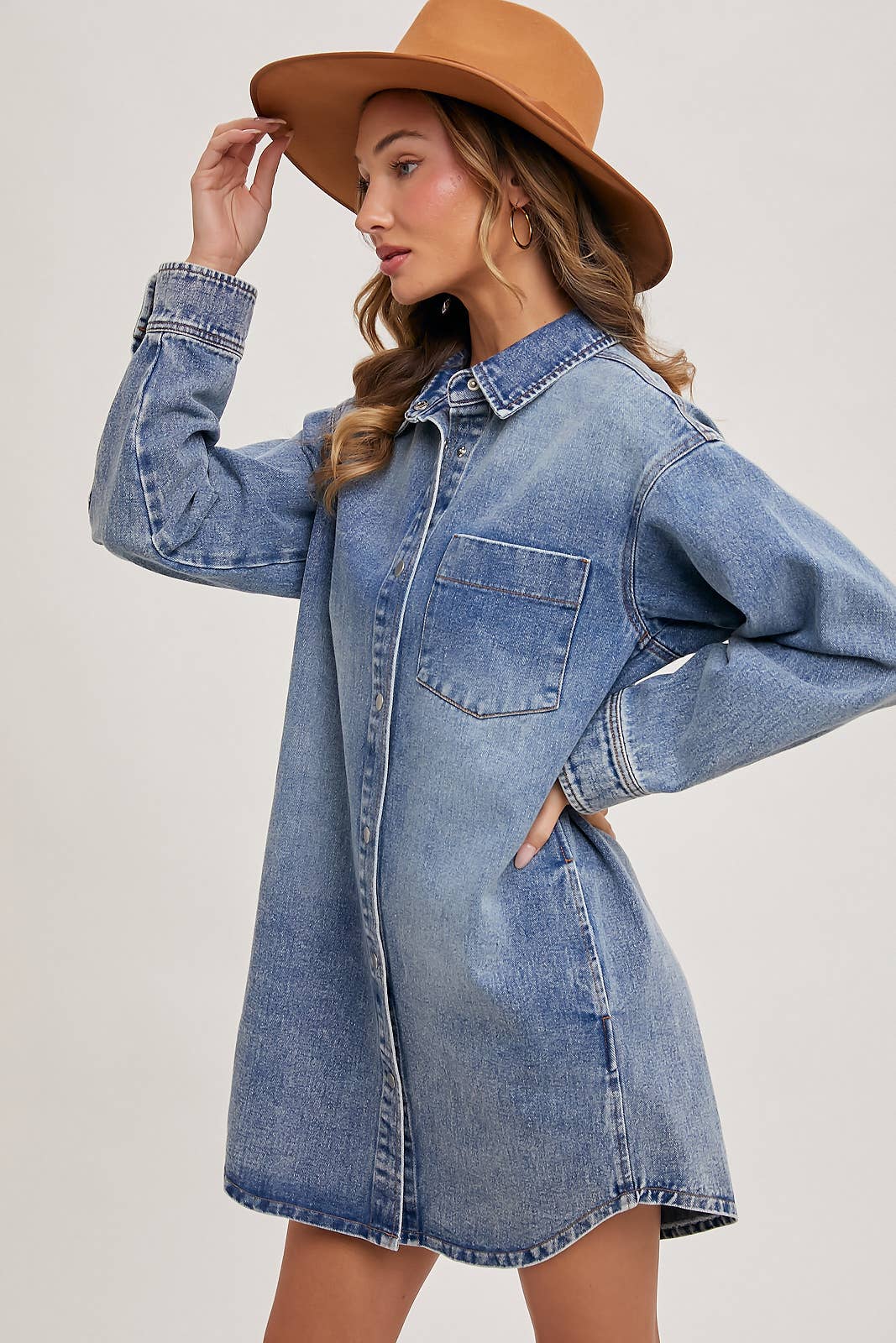DENIM BUTTON DOWN SHIRT DRESS WITH POCKETS